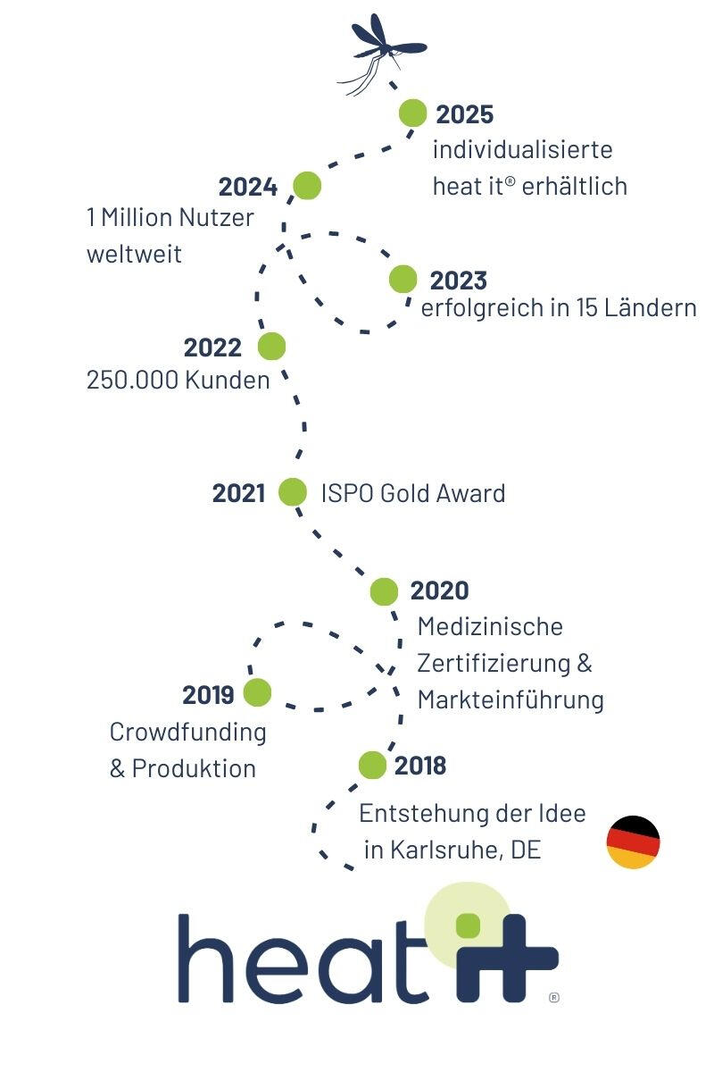 Wie viele gute Ideen entstand auch unsere aus einem Problem heraus: juckende Insektenstiche, für die es keine gute, natürliche Lösung gab. Was als Studentenidee begann, entwickelte sich zu einem internationalen Erfolg mit medizinischen Zertifizierungen, Auszeichnungen und Millionen zufriedener Nutzer weltweit.Trotz dieses Wachstums haben wir unsere Wurzeln nie vergessen. Wir sind sehr stolz darauf, dass wir die Produktion in eigener Hand behalten haben: Jeder heat it® wird nach wie vor in Deutschland hergestellt.